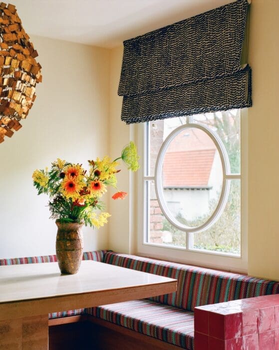 QUEL TEMPS FAIT-IL ? Réponse en jetant un œil, par la fenêtre. Vase vintage en céramique de Vallauris. Banquette tapissée d’un tissu d’ameublement Pierre Frey, stores sur mesure, tissus façon tweed, Pierre Frey.