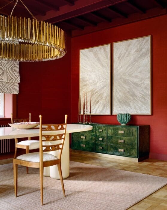 DÎNER EN AMOUREUX ? Ou en famille, c’est selon ! Autour de la table Clarence en laque de Victoria-Maria pour Heimat. Chaises italiennes, années 1950 de Watteau. Revêtement mural soie sauvage de Jim Thompson. Tapis Millepoints.