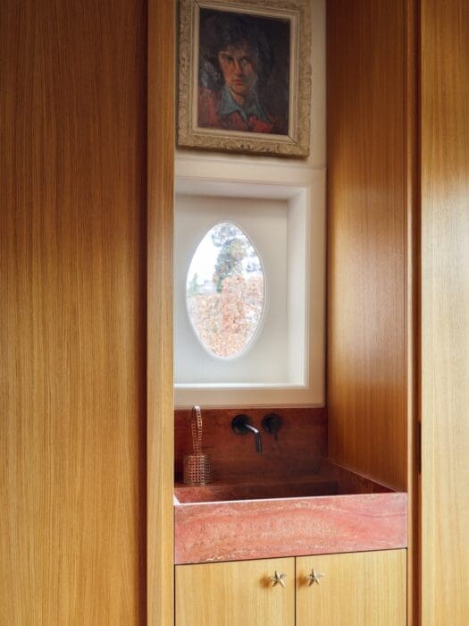 Sous l’escalier, lavabo anobli par deux petits tableaux chinés.