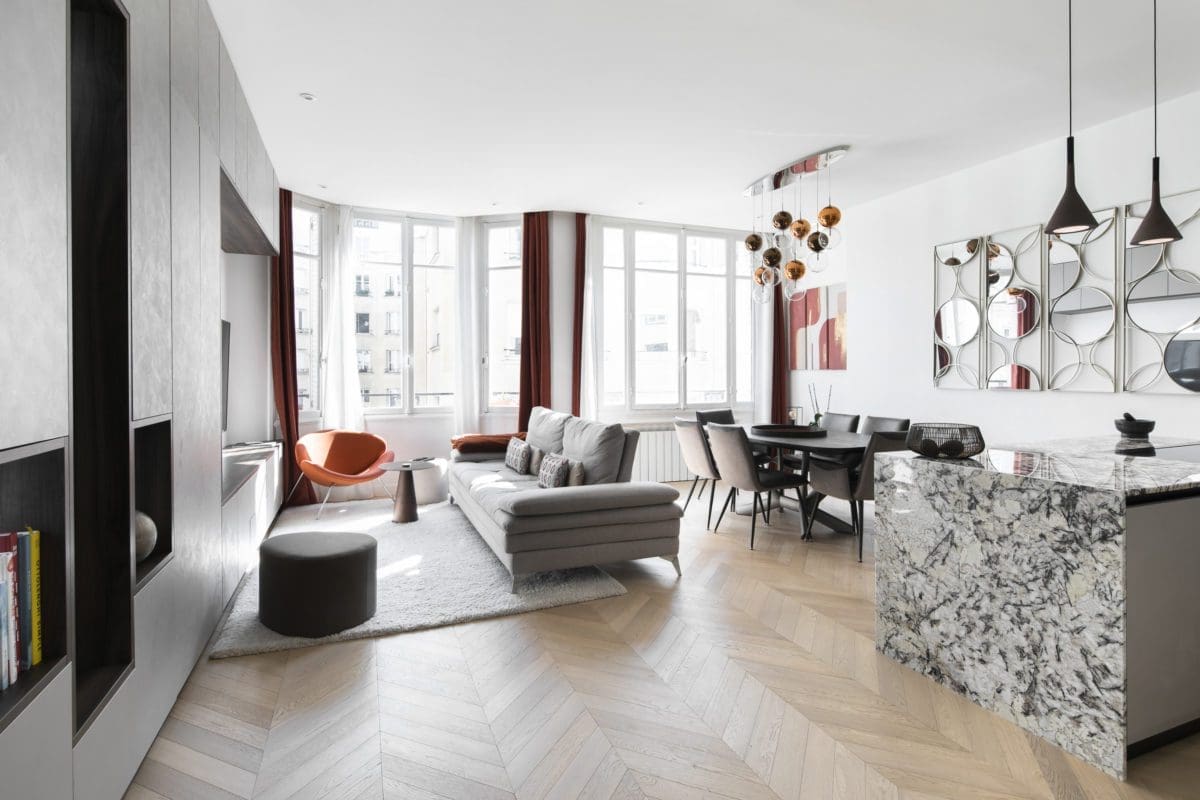 Reste à reconstruire, à s’approprier le moindre mètre carré, à l’exploiter avec intelligence. Une fois encore, les deux pros tombent d’accord pour créer, comme dans les appartements contemporains, une grande pièce à vivre regroupant salon, salle à manger et cuisine, sans autre séparation que des jeux de couleurs et de matières. « Je voulais que tout soit fluide, que la circulation soit facile, d’où l’idée de mettre du parquet blond en point de Hongrie partout, et de faire en sorte que, depuis la chambre parentale, le regard se projette dans le living-room. »