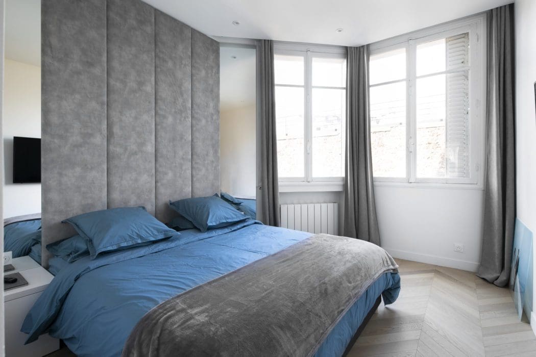 une ambiance chaleureuse tout en sobriété. Les chevets ont été dessinés par Yohan. Derrière la tête de lit créée sur mesure se cache la salle de bains. Rideaux Madura.