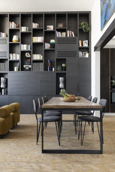 Malgré l’ampleur des modifications à effectuer, le charme de l’appartement opère immédiatement sur ses futurs acquéreurs. Volumes de 5 mètres sous le plafond, verrière d’artiste : le couple de quadragénaires, parents de trois enfants, se laisse séduire par ses atouts et se lance dans l’aventure. C’est tout naturellement qu’ils font appel à la talentueuse Tatiana, avec laquelle ils ont déjà beaucoup travaillé. Le courant passe à nouveau, les idées fusent pour tout transformer et réorganiser. En dépit de sa vaste sur-face, il était difficile d’appréhender la véritable envergure du duplex, mal aménagé. L’étage inférieur était un labyrinthe de pièces à vivre articulées autour d’un long couloir : Tatiana commence par faire place nette pour ensuite se réapproprier les lieux. Les travaux, qui s’enchaînent sur huit mois, sont conséquents, car la structure est entièrement remaniée. Aidée d’un ingénieur, Tatiana fait tomber les cloisons, tandis que les murs porteurs sont remplacés par des poutres IPN. Les coffrages font place à des espaces aérés et spacieux. « À l’origine, on entrait face à un mur; les pièces à vivre et le cabinet du médecin étaient essentiellement au cinquième, et les chambres en haut, desservies par un petit escalier droit situé dans l’ancienne salle à manger », se remémore-t-elle. La circulation est revue, la distribution des pièces est renversée : quatre chambres possédant toutes leur salle de bains respective, un salon magistral avec une cuisine ouverte sur la salle à manger, un coin dégustation et enfin un bar à vin. Le salon télé est placé à côté de l’espace nuit, dans la partie basse, pour plus de tranquillité.