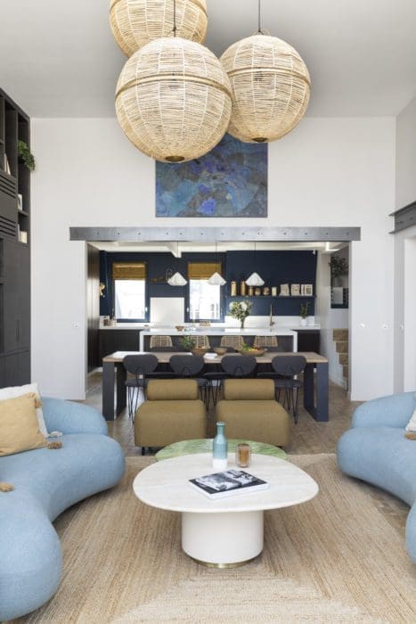 ATELIER D’ARTISTE. Le salon tout en courbes est merveilleusement éclairé grâce à sa verrière repeinte en blanc, dont la marquise a été refaite pour accueillir un double vitrage. Sofa bleu Tacchini ; table basse « Fiucimino » Laura Gonzales; fauteuils moutarde Eno Studio; suspensions en raphia et laiton Honoré Déco; tapis AM.PM. L’échelle et les deux fauteuils « Swan » signés Arne Jacobsen ont été chinés.