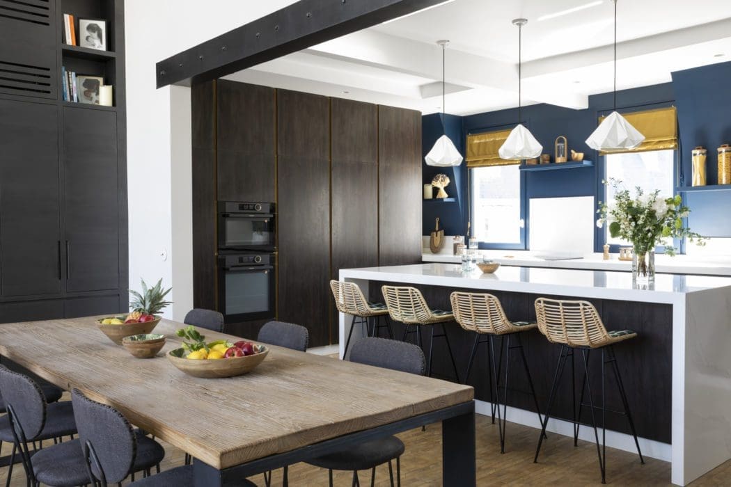 CUISINE SUR MESURE. Elle est réchauffée par des tons bleus et jaunes Ressource et illuminée par un plan de travail en Silestone « Et Calacatta Gold », où se reflètent les lampes « Hatton » Original BTC. Tabourets de bar en rotin « Capurgana » Drawer. Les stores, réalisés par la tapissière Charlotte Decroix, protègent de l’orientation plein sud.