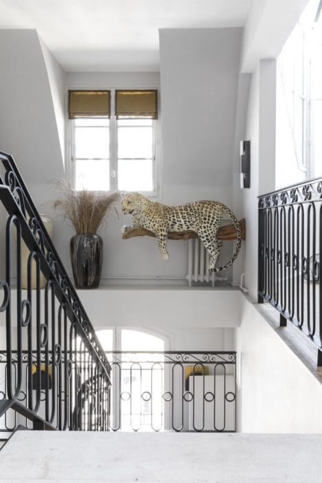 MÉLANGE DE STYLES. Touche d’exotisme et d’humour, une peluche léopard des neiges a été posée devant le radiateur par les propriétaires. « L’idée vient de la boutique Vuitton, où les mêmes ont été utilisées en vitrine. Elle n’est pas empaillée! » précisent-ils. L’escalier en pierre de Bourgogne qui mène aux chambres et son garde-corps élégant semblent avoir toujours été là.