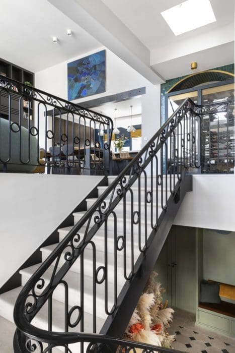 En sacrifiant un ancien bureau, Tatiana déplace et modifie l’accès au niveau supérieur avec une trémie de 15 mètres carrés posée dès l’entrée. Elle y installe un escalier en pierre de Bourgogne, ponctué par un palier, qui permet enfin d’apprécier la hauteur des lieux et apporte de la prestance à l’ensemble. « Dès que l’on passe la porte, on est impressionné! Je me suis inspirée de la cage d’escalier de mon ancien duplex XVIIIe siècle dans le Marais lorsque j’ai fait forger le garde-corps », raconte la décoratrice parisienne.