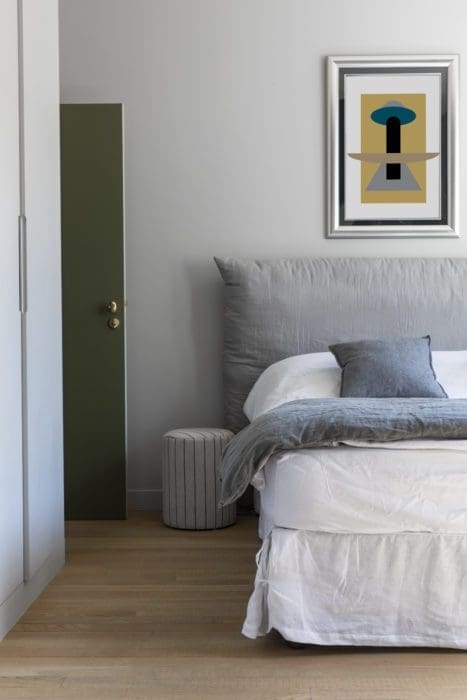 ÉLÉGANCE SOBRE. Placée non loin du salon télé, cette chambre aborde des tonalités grises et claires, sans oublier toutefois les touches de couleur si chère à la décoratrice, comme sur la porte. Tatiana a ajouté des placards sur mesure pour épurer le volume. Peinture murale Ressource.