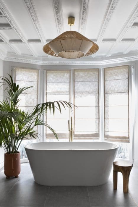 MISE EN SCÈNE. Emplacement théâtral pour la baignoire de la salle de bains du couple. À l’origine dépourvue d’arrivée d’eau, la pièce a dû être surélevée, une contrainte technique qui a inspiré cette disposition façon îlot. L’intérieur est illuminé par les fenêtres d’origine, qui suivent la courbe de la façade, et par une suspension Maison Paloma. Cache-pot AM.PM; tabouret Nordal.