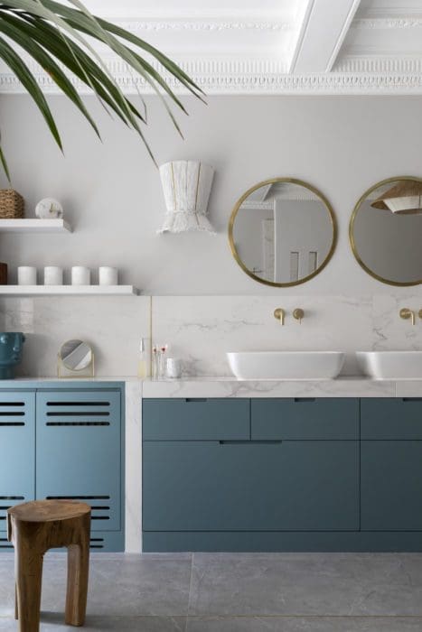 SALLE DE BAINS PARENTALE. Cette vaste pièce d’environ 20 mètres carrés s’habille de tonalités douces Ressource : « Source FOR03 » pour les menuiseries et « Maya RSB03 » pour les murs. Au-dessus du plan vasque, des miroirs ronds assouplissent les lignes droites. Robinetterie Crosswater; applique Maison Paloma; tabouret Nordal.