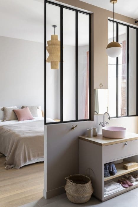 SEMI-CLOISONNEMENT. Dans la chambre de l’une des filles, le plancher clair, les matières naturelles et les tonalités poudrées renforcent la douceur de cet espace cocon. Au-dessus du lit, une suspension Tinja. Un semi-cloisonnement face au lit apporte la luminosité nécessaire dans la salle d’eau. Suspension La Redoute Intérieurs.