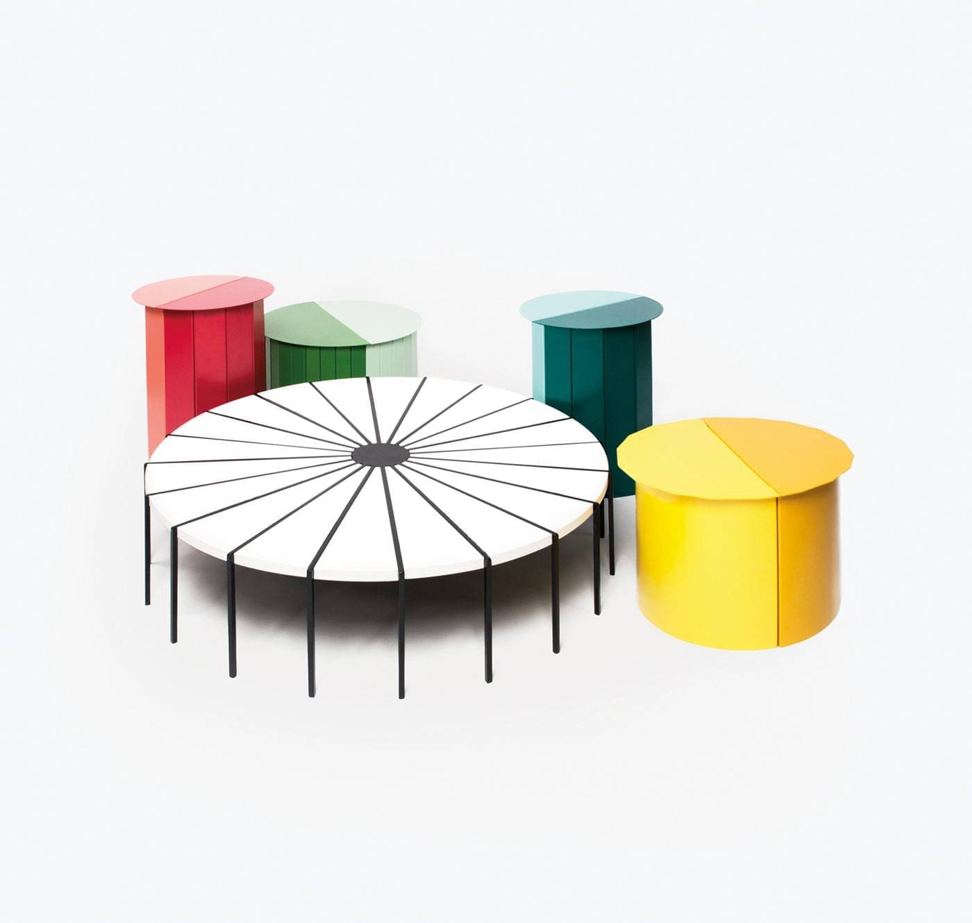 Camille : La couleur et la lumière sont à l’honneur ! Une table basse ronde dessinée comme un soleil et découpée tel un spectre ainsi que des tables d’appoint pouvant faire office de tabourets sont les éléments phares de cette collection.