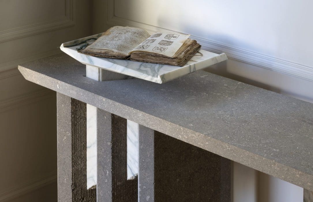 Celui qui me fascine en ce moment, c’est un manuscrit déniché en Suisse illustrant avec des symboles et des anecdotes les armes des familles patriciennes helvètes. Je lui ai dédié une console de la collection « La Mémoire des Pierres », avec un pupitre aux angles acérés et aux pierres brutalistes griffées et taillées à vif.