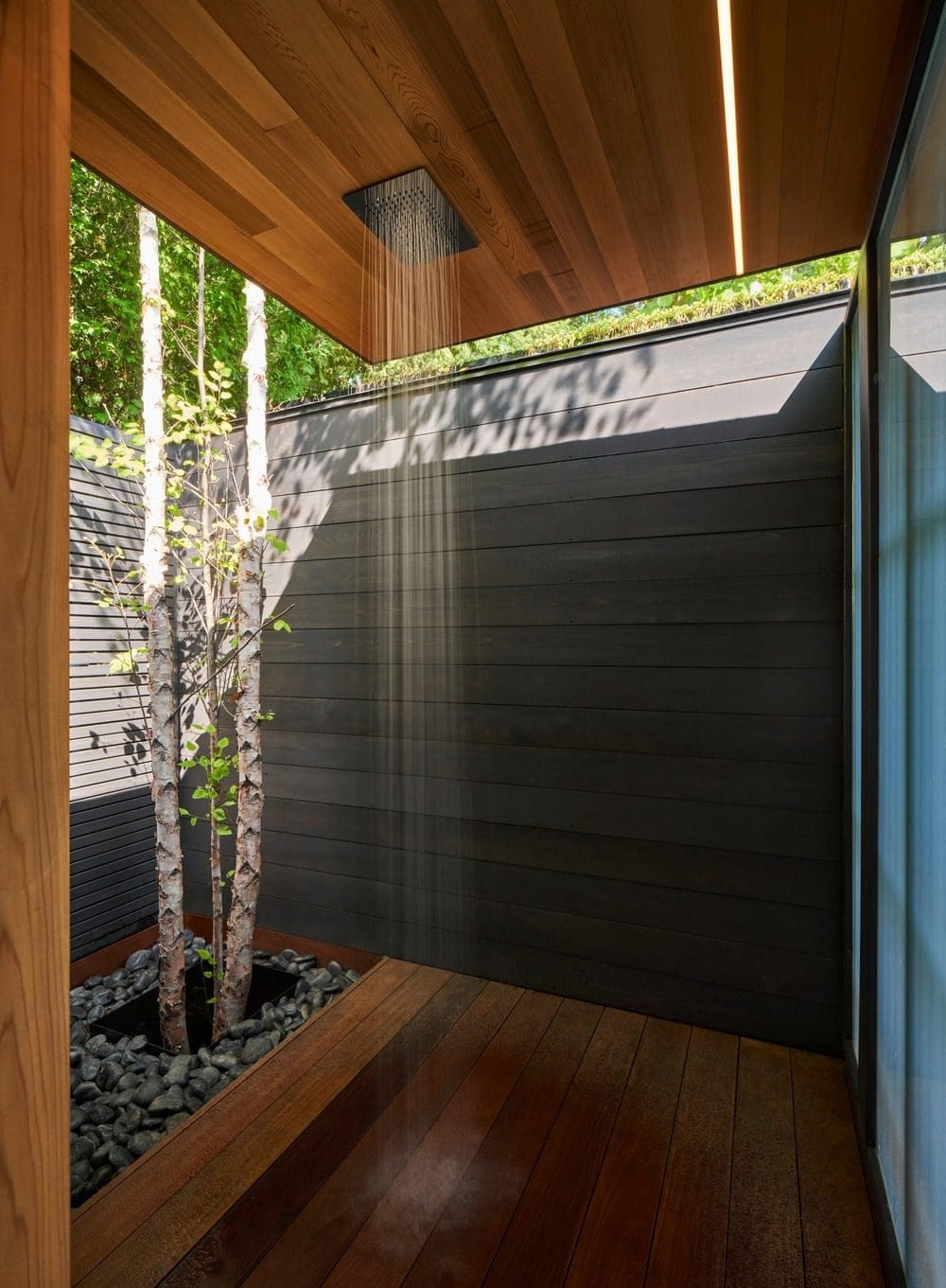 Ces panneaux de verre admettent une lumière naturelle abondante, limitant le besoin d’éclairage artificiel tout en offrant une séparation visuelle; la nuit tombée, la lumière du jour est complétée par des LED réglables intégrées au plafond. Le noyau du pavillon, fini avec une palette chaude et naturelle de contreplaqué de qualité marine avec placage de cèdre et planches de cèdre huilé, est retourné à une salle de bain, un vestiaire et une douche à côté d’une ouverture dans le toit qui encadre un bouleau et une vue du ciel – des zones habilement cloisonnées mais ouvertes sur le paysage environnant et l’activité de la piscine.