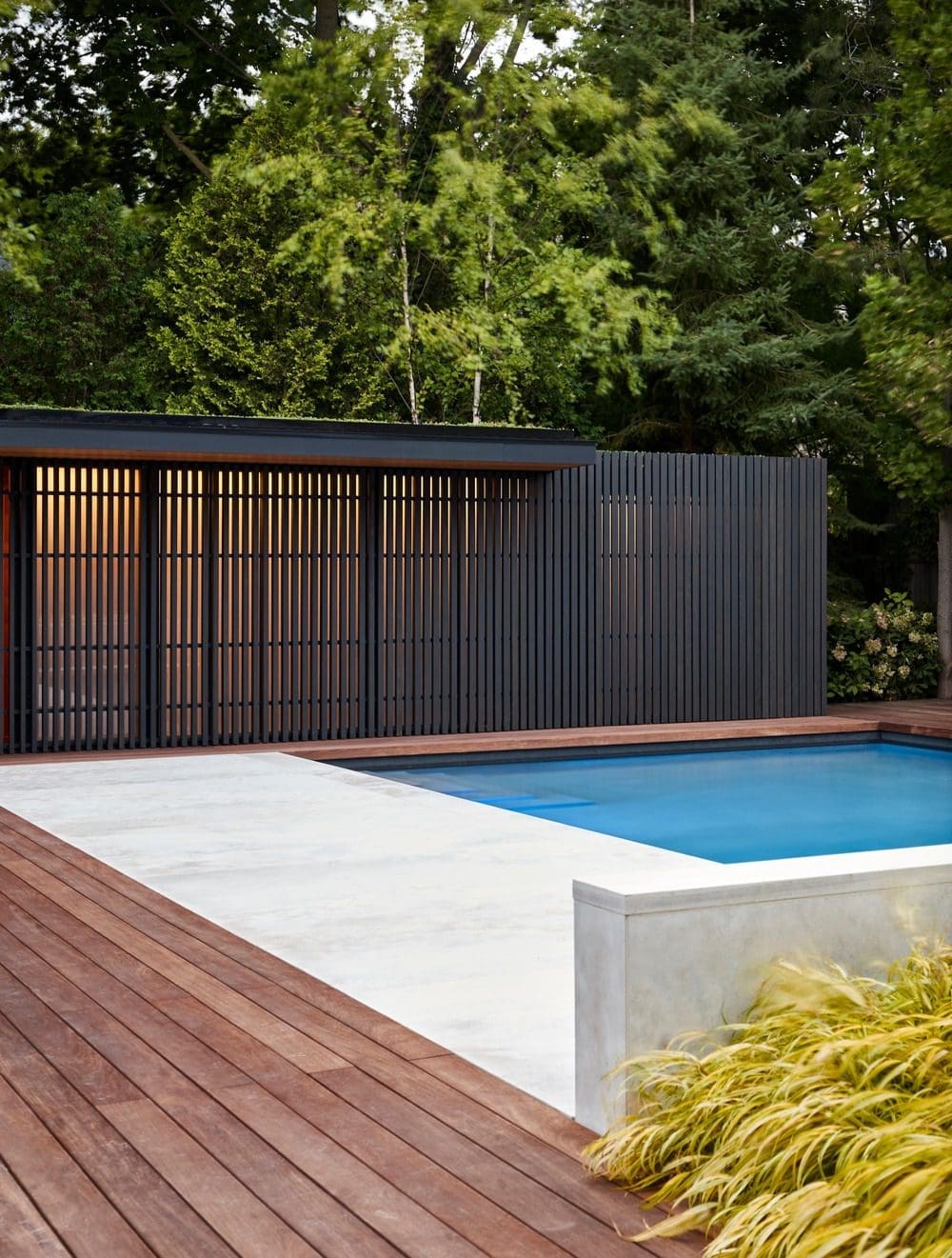 De l’intérieur du pavillon, le plancher en ipé se connecte aux terrasses en ipé huilé qui encadrent la piscine. Reflétant la géométrie du pavillon, la nouvelle piscine rectangulaire est bordée de calcaire algonquin qui s’étend horizontalement sur un côté pour former une terrasse assez large pour les chaises longues; le plus proche de la maison, le même calcaire fait office de pont vers la terrasse. Les côtés restants de la piscine sont flanqués de terrasses en ipé huilé qui affleurent au niveau de la pelouse. L’utilisation de surfaces de marche continues dans toute la cour unifie le pavillon avec son cadre – un effet amélioré par un toit planté qui prolonge visuellement la pelouse jusqu’à la végétation du périmètre vu de dessus.
