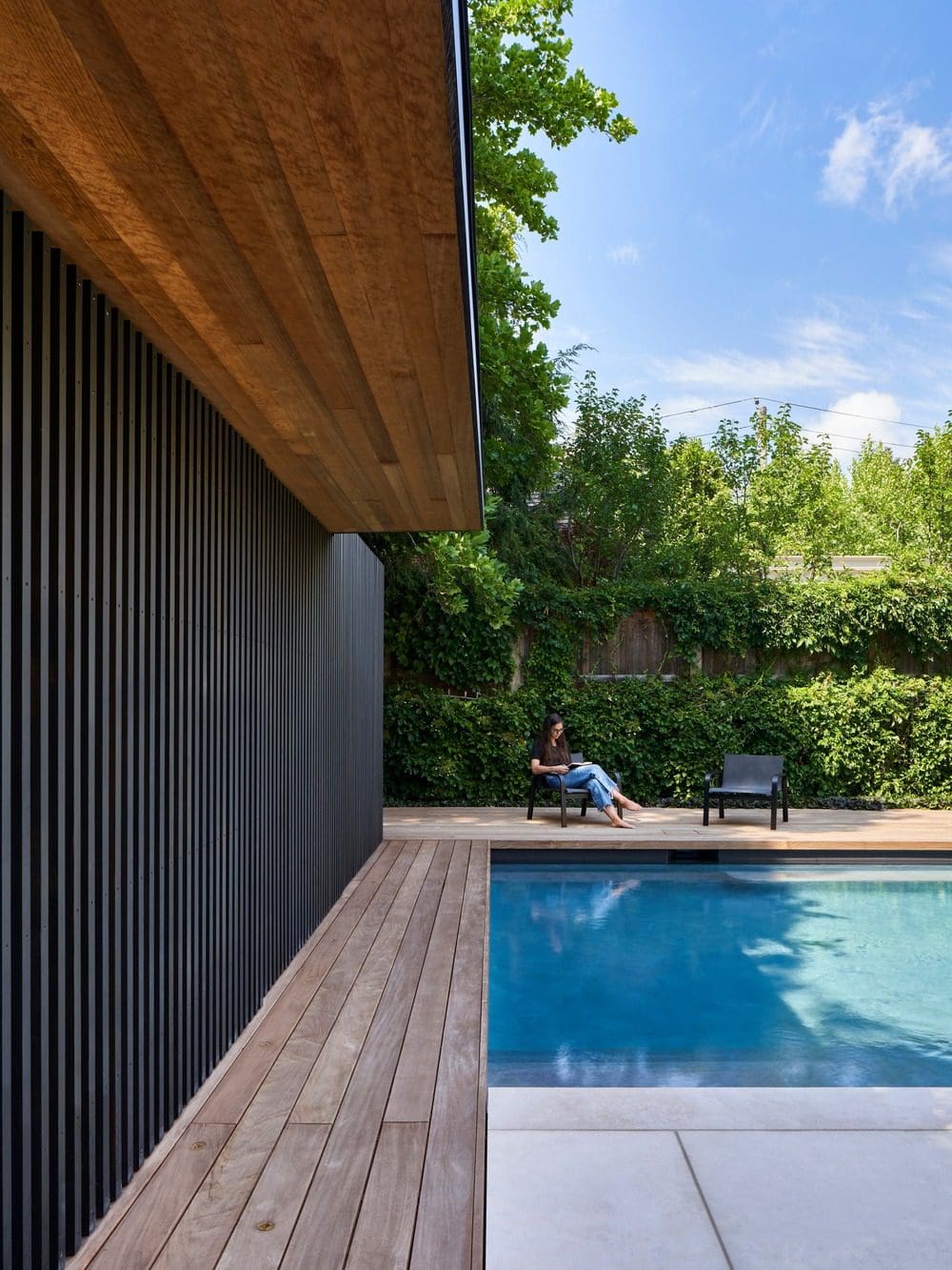 Le point focal du paysage est un nouveau pavillon de 47 mètres carrés couvrant presque toute la largeur de la cour et poussé aussi près de la limite de propriété arrière que le permet. Planant au-dessus du niveau naturel sur des piliers pour atténuer son impact sur les arbres adjacents, la forme linéaire du pavillon est configurée pour préserver la végétation existante. Revêtu de noir pour contraster avec le feuillage environnant tout en s’éloignant visuellement en arrière-plan, le pavillon fonctionne comme un écran, créant l’illusion d’un espace illimité au-delà.
