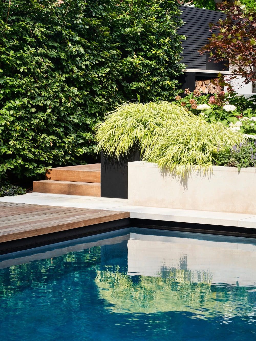 De la terrasse de la salle à manger à la piscine, le changement d’élévation est géré par une berme — prise en sandwich entre deux dispositifs de retenue de calcaire bas, encore subdivisée par des jardinières en aluminium noir et densément feuilletée pour négocier sa descente abrupte — en insérant un terrain intermédiaire pour créer un sentiment de distance entre la piscine et terrasse. Ici et ailleurs, les plantations (sélectionnées en collaboration avec Tina McMullen) sont structurées pour un look moderne qui conserve néanmoins la sensation lâche et hirsute du jardin d’origine.