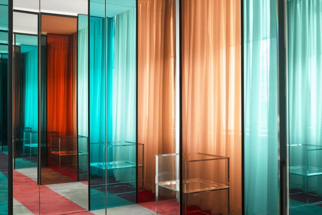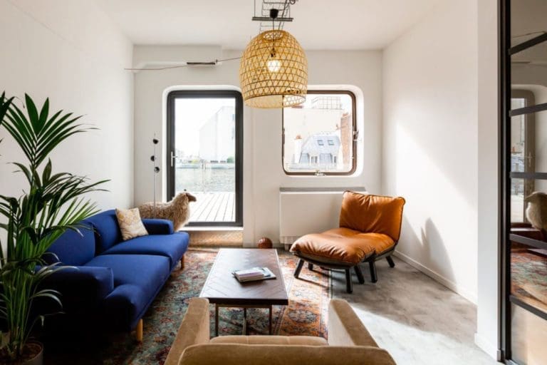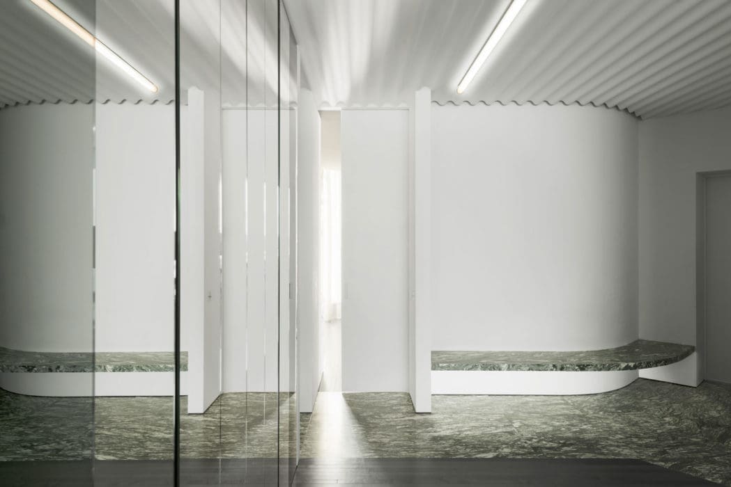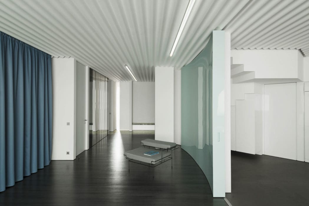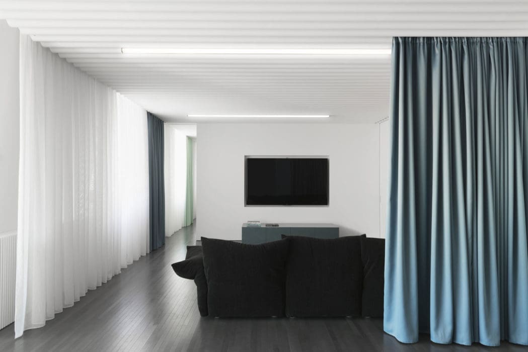 Les 150 m2 de plafond qui unifie les espaces salon, entrée et cuisine, semblent être agités par la houle, et viennent bouleverser l’ADN minimaliste du lieu. Une ondulation dans laquelle s’encastrent, entre les ridules, des tubes LED ambre sur-mesure. La lumière naturelle, quant à elle, se reflète sur le parquet en érable, fabriqué à Padou en Italie.