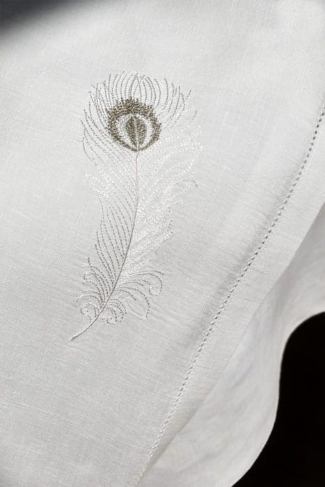 Nappe et serviettes en lin, brodées pour Cheval Blanc par l’entreprise Garnier-Thiebaut, Prix sur demande. garnier-thiebaut.fr