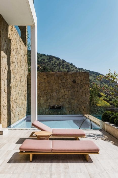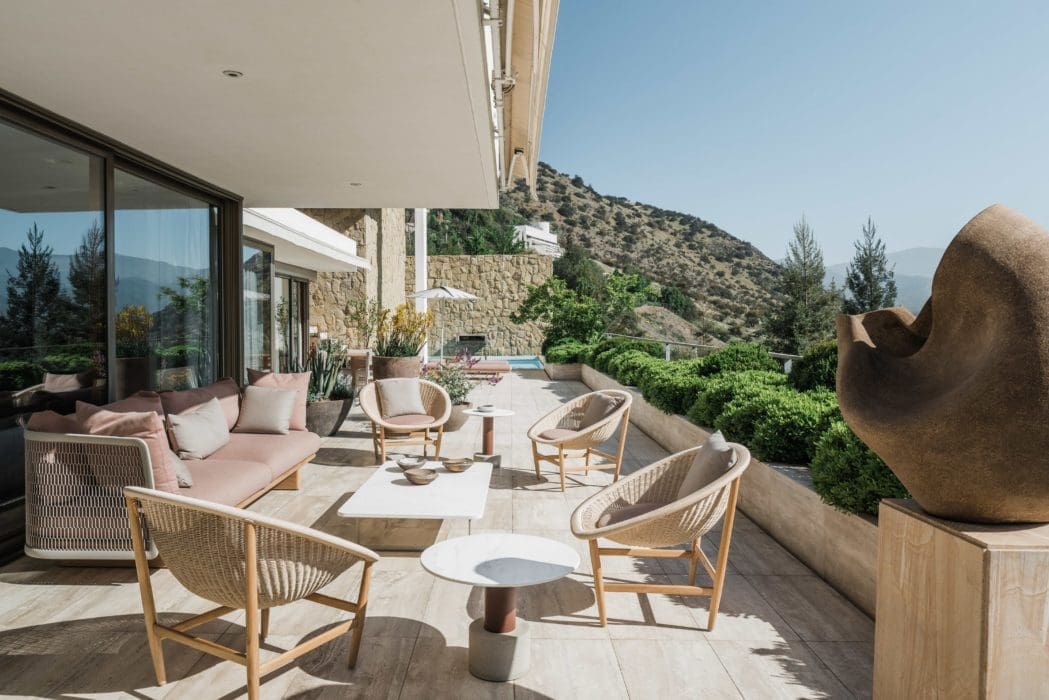 Pénétrer dans le salon incite à franchir la frontière quasiment invisible qui le sépare de la terrasse. Imaginée et conçue comme un jardin suspendu, elle donne sur la cordillère des Andes, plus haute chaîne de montagnes d’Amérique latine. Le studio de Paula Gutiérrez a travaillé en collaboration avec Macarena Calvo, de l’agence Calvo & Elgueta. Toutes deux ont opté pour une création privilégiant des végétaux verts douze mois par an et peu gourmands en eau. L’option des plantes et arbustes en pots s’est, dès lors, imposée comme une solution idéale et écoresponsable.
