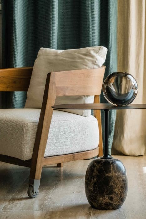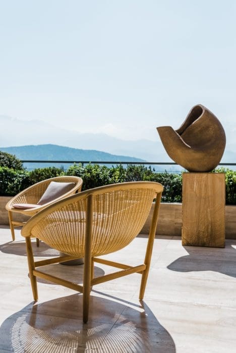 Véritable pièce à vivre, bien ombragée aux heures les plus chaudes de la journée, la terrasse mixe avec bonheur lignes droites et rondes. Kettal, l’emblématique marque espagnole de mobilier outdoor respectueuse de l’environnement, y règne en maîtresse absolue. Côté salon, les fauteuils « Basket » de Nanna et Jørgen Ditzel, délicieusement fifties, et les tables d’appoint de la collection « Roll » viennent adoucir les lignes strictes du canapé « Mesh », de la collection signée Patricia Urquiola, et de la table basse « Bitta » de Rodolfo Dordoni. Un bel équilibre entre rectitude et rondeur qui donne à l’ensemble toute sa cohérence.