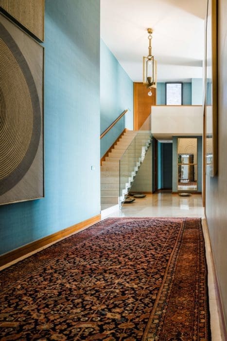Le hall et le couloir du rez-de-chaussée, qui distribuent les différentes pièces, donnent le ton : au sol, un somptueux tapis persan antique, au mur, deux grandes œuvres signées de l’artiste chilien Andres Vio, et au plafond, une suspension du designer Hervé van der Straeten. La cage d’ascenseur participe elle aussi à la mise en scène : peinte en noir, elle installe un subtil jeu d’ombres et de lumières avec les structures lumineuses de Javier Toro Blum.