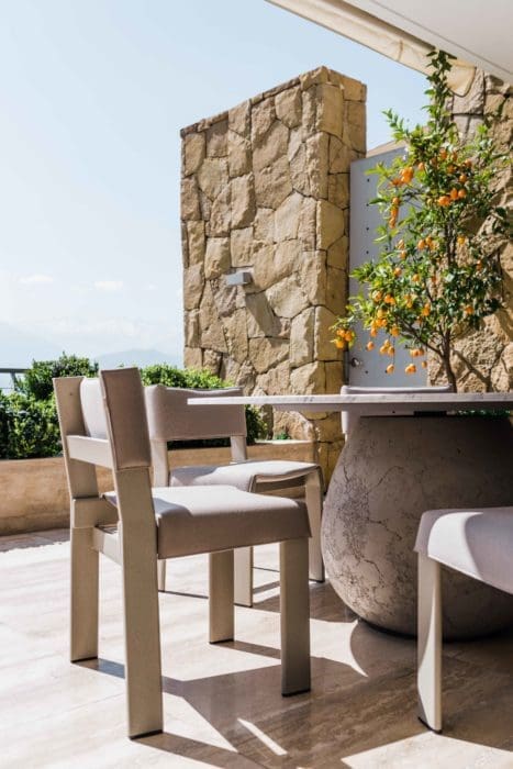 Véritable pièce à vivre, bien ombragée aux heures les plus chaudes de la journée, la terrasse mixe avec bonheur lignes droites et rondes. Kettal, l’emblématique marque espagnole de mobilier outdoor respectueuse de l’environnement, y règne en maîtresse absolue. Côté salon, les fauteuils « Basket » de Nanna et Jørgen Ditzel, délicieusement fifties, et les tables d’appoint de la collection « Roll » viennent adoucir les lignes strictes du canapé « Mesh », de la collection signée Patricia Urquiola, et de la table basse « Bitta » de Rodolfo Dordoni. Un bel équilibre entre rectitude et rondeur qui donne à l’ensemble toute sa cohérence.