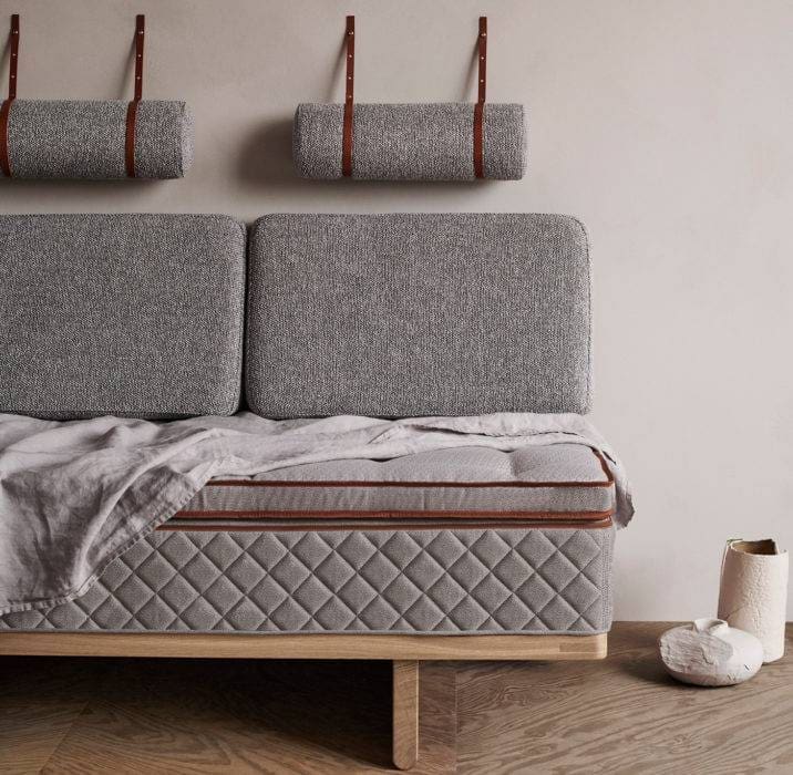 Produit avec le spécialiste du sommeil DUX, il combine design fonctionnel, savoir-faire artisanal et équipements de haute qualité. Structure en chêne massif huilé certifié FSC®, matelas DUX à ressorts expressément élaboré, dossiers et appuie-tête en textile, sangles de cuir pleine fleur, assemblages par tenons et mortaises, bien visibles, si caractéristiques de Børge Mogensen : c’est le nec plus ultra.
