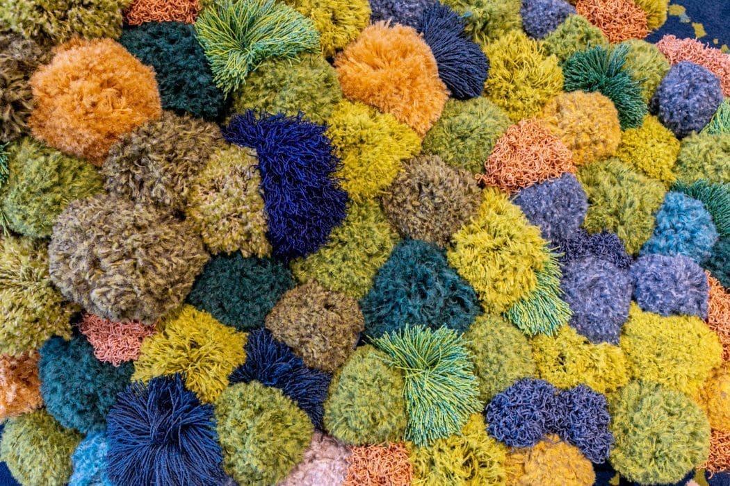 Différents monticules de mousse parsèment cette promenade en forêt. Ils ont été réalisés à partir de rebuts de mandrins de moquette, recoupés en différentes hauteurs puis peints en vert. Inspirée par la structure même du fil – mousseux, torsadé, frisotté – Elise crée différents pompons représentant les différentes mousses qui jonchent les talus.