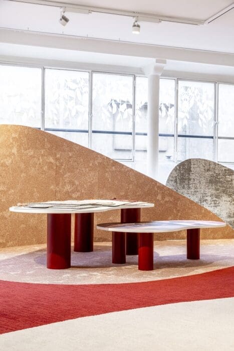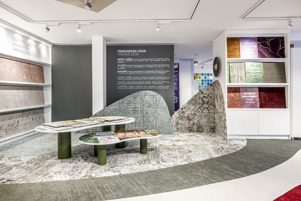 Dans la zone Esprits Libres, les motifs minéraux luxueux et les tons profonds invitent à une expérience sensorielle audacieuse. Vivants privilégie des palettes organiques et apaisantes, connectant bien-être et nature. Enfin, Nomades célèbre le mouvement et l’adaptabilité, avec des textures et couleurs qui évoluent selon l’espace.