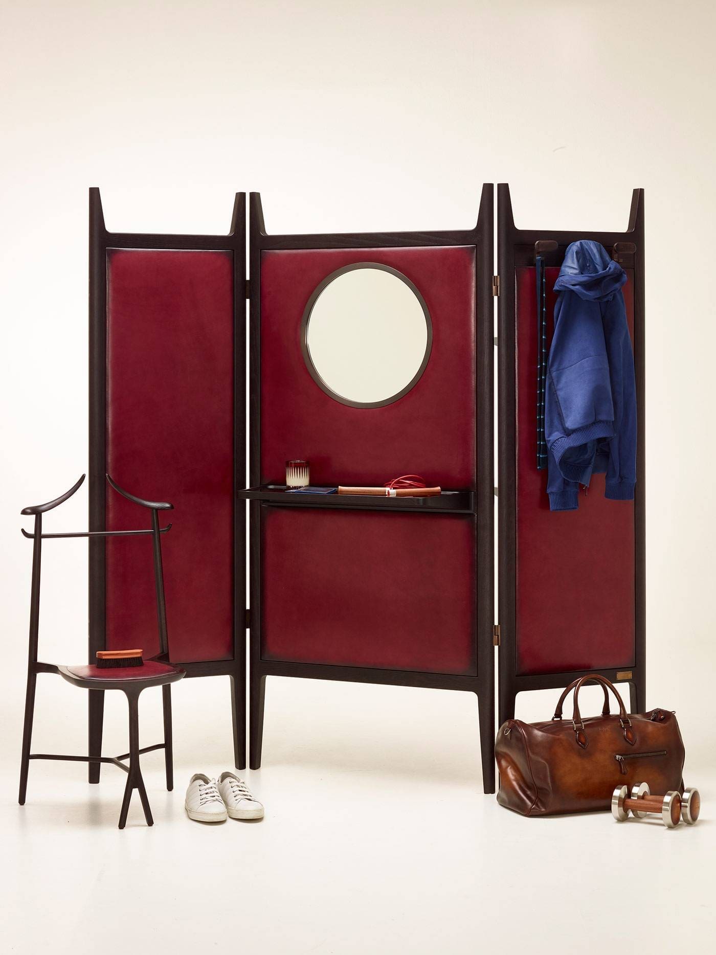 Le paravent se décline en 4 coloris (cerise, gris, vert bouteille et bleu) et s’équipe d’étagères, patères et d’un miroir rond au cadre cuivré. La chaise quant à elle, dispose d’une assise en cuir Berluti qui viendra accueillir pantalon, chemise, veste, pull ou sac à la tombée de la nuit…