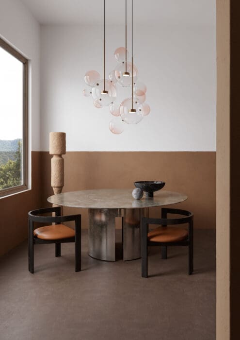Bolle Coloré et Scarabei. Ce sont les toutes dernières créations signées Giopato & Coombes. La première est un émerveillement poétique, véritable ode à la couleur et à la lumière. Ses sphères suspendues rappellent les bulles de savon de l’enfance, flottant vers le ciel.