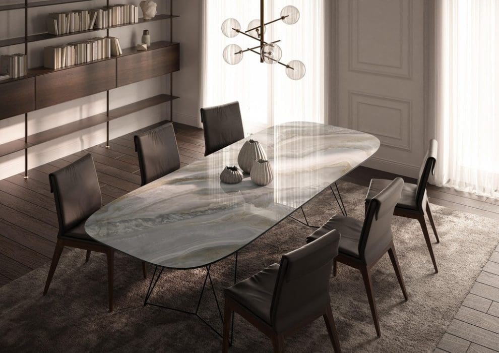 « Diamond » offre ainsi une luxueuse palette minérale, bluffante de naturel. Ultra pictural, « Calacatta Black » convoque avec caractère l’intensité d’un marbre noir, nuancé de reflets beige et strié de veines immaculées, tandis que « Cristallo Gold », s’approprie la douceur laiteuse et translucide du cristal, ponctuée de teintes dorées et ambrées, dans le même esprit graphique. L’associer à la finition « Caress », légèrement opaque, permet de faire coïncider sensation visuelle et toucher velouté. A première vue aux antipodes, ces deux coloris partagent néanmoins une vision esthétique assumée, et la volonté commune de repousser les limites de la créativité, des pièces d’eau à la cuisine, en passant par le mobilier, grâce à différents formats et épaisseurs. Ainsi, en 12 et 20 mm, ils s’accommodent parfaitement des contraintes liées à l’utilisation en plan de travail, sans faire la moindre concession sur le style. Tout aussi intemporels, « Onice Grigio » et « Cristallo Macchia Vecchia » cultivent avec expressivité leur appartenance à la riche histoire architecturale italienne. Conjugués à la finition « Poli Starlit », et à une épaisseur de 3 ou 5 mm, ces coloris ouvrent le champ des possibles en matière de mobilier.