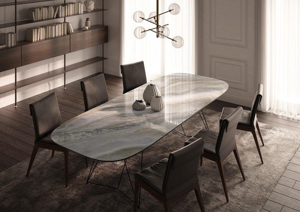 « Diamond » offre ainsi une luxueuse palette minérale, bluffante de naturel. Ultra pictural, « Calacatta Black » convoque avec caractère l’intensité d’un marbre noir, nuancé de reflets beige et strié de veines immaculées, tandis que « Cristallo Gold », s’approprie la douceur laiteuse et translucide du cristal, ponctuée de teintes dorées et ambrées, dans le même esprit graphique. L’associer à la finition « Caress », légèrement opaque, permet de faire coïncider sensation visuelle et toucher velouté. A première vue aux antipodes, ces deux coloris partagent néanmoins une vision esthétique assumée, et la volonté commune de repousser les limites de la créativité, des pièces d’eau à la cuisine, en passant par le mobilier, grâce à différents formats et épaisseurs. Ainsi, en 12 et 20 mm, ils s’accommodent parfaitement des contraintes liées à l’utilisation en plan de travail, sans faire la moindre concession sur le style. Tout aussi intemporels, « Onice Grigio » et « Cristallo Macchia Vecchia » cultivent avec expressivité leur appartenance à la riche histoire architecturale italienne. Conjugués à la finition « Poli Starlit », et à une épaisseur de 3 ou 5 mm, ces coloris ouvrent le champ des possibles en matière de mobilier.