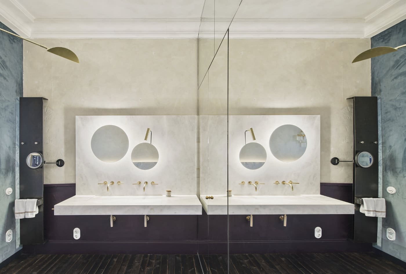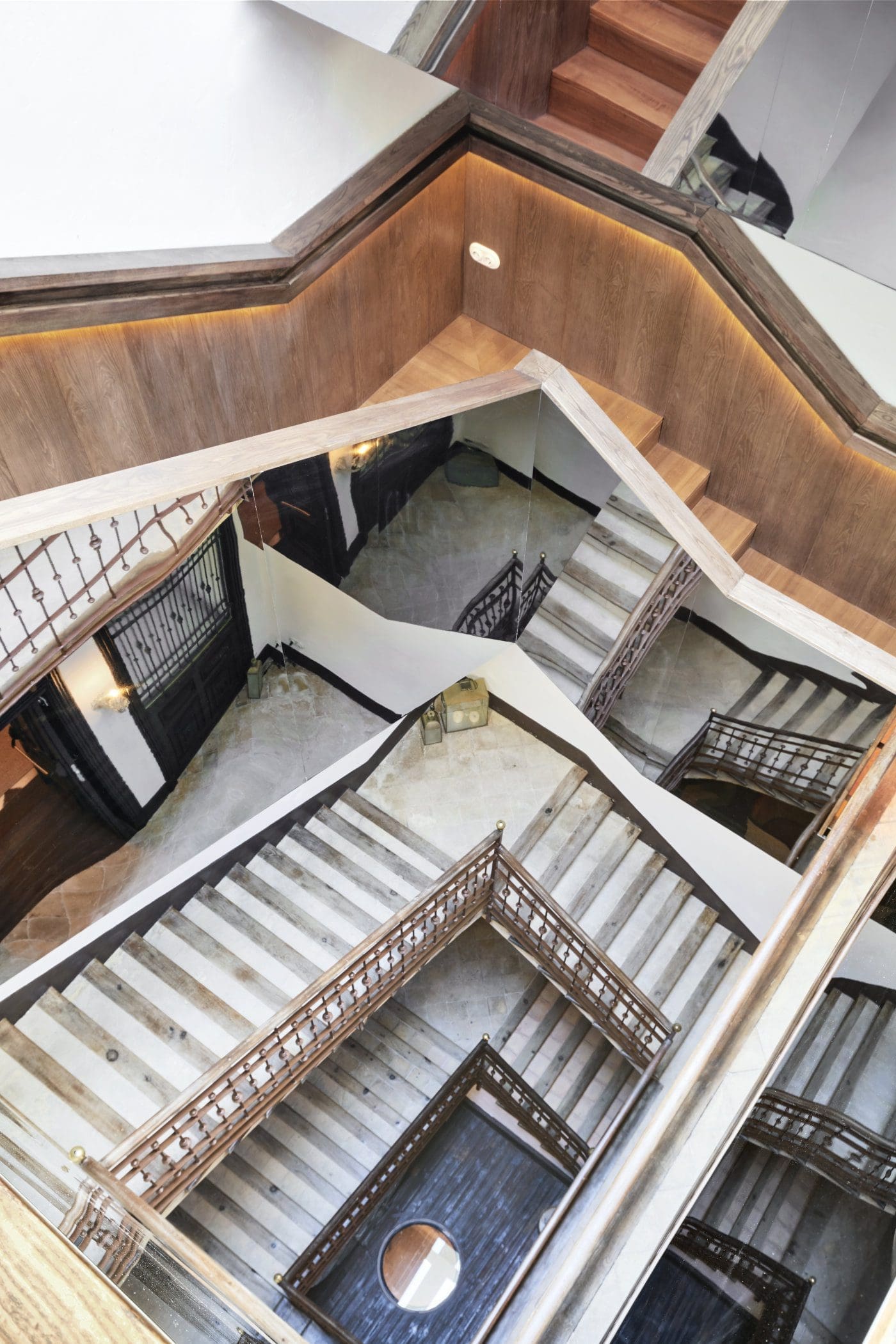 Dans l’escalier principal, le puits de lumière est inondé d’eau devenant une petite piscine avec un fond transparent qui crée un jeu de lumière à travers l’eau, inondant l’escalier de reflets caustiques … La nouvelle section d’escalier qui était des reflets à travers la cage d’escalier tandis que l’intérieur de l’escalier se termine par un noyer chaud et robuste … A l’étage du escalier, un verre circulaire encastré dans la dalle se connecte au spa situé au sous-sol et permet à l’utilisateur du spa au sous-sol de voir le ciel à travers le plan d’eau sur le toit … Les nouvelles salles de bains dans les chambres sont masquées, créant une scénographie où la salle de bain se trouve être le nouvel ensemble; au lieu de cacher ce nouvel élément, son utilisation est célébrée …