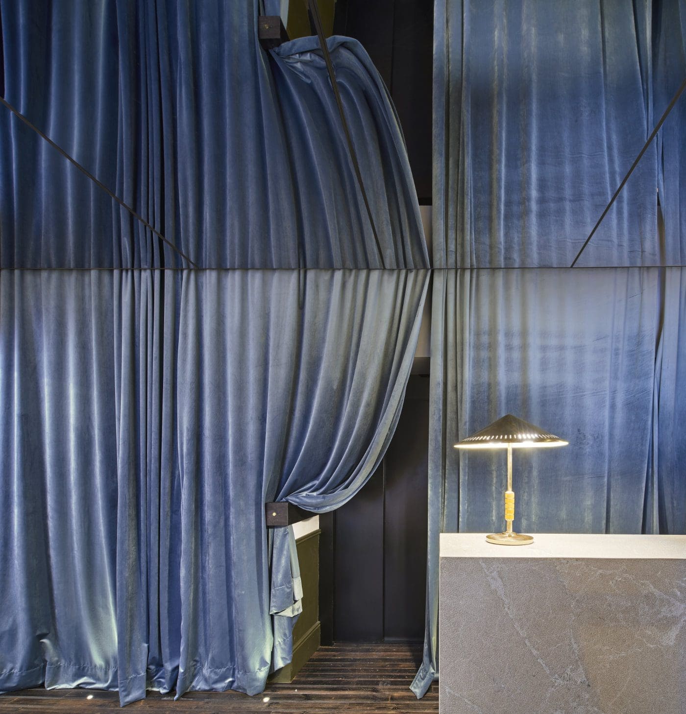 Dans le hall d’entrée, un plafond miroir cache les nouvelles installations et double la hauteur du bar et du rideau de velours qui l’entoure …