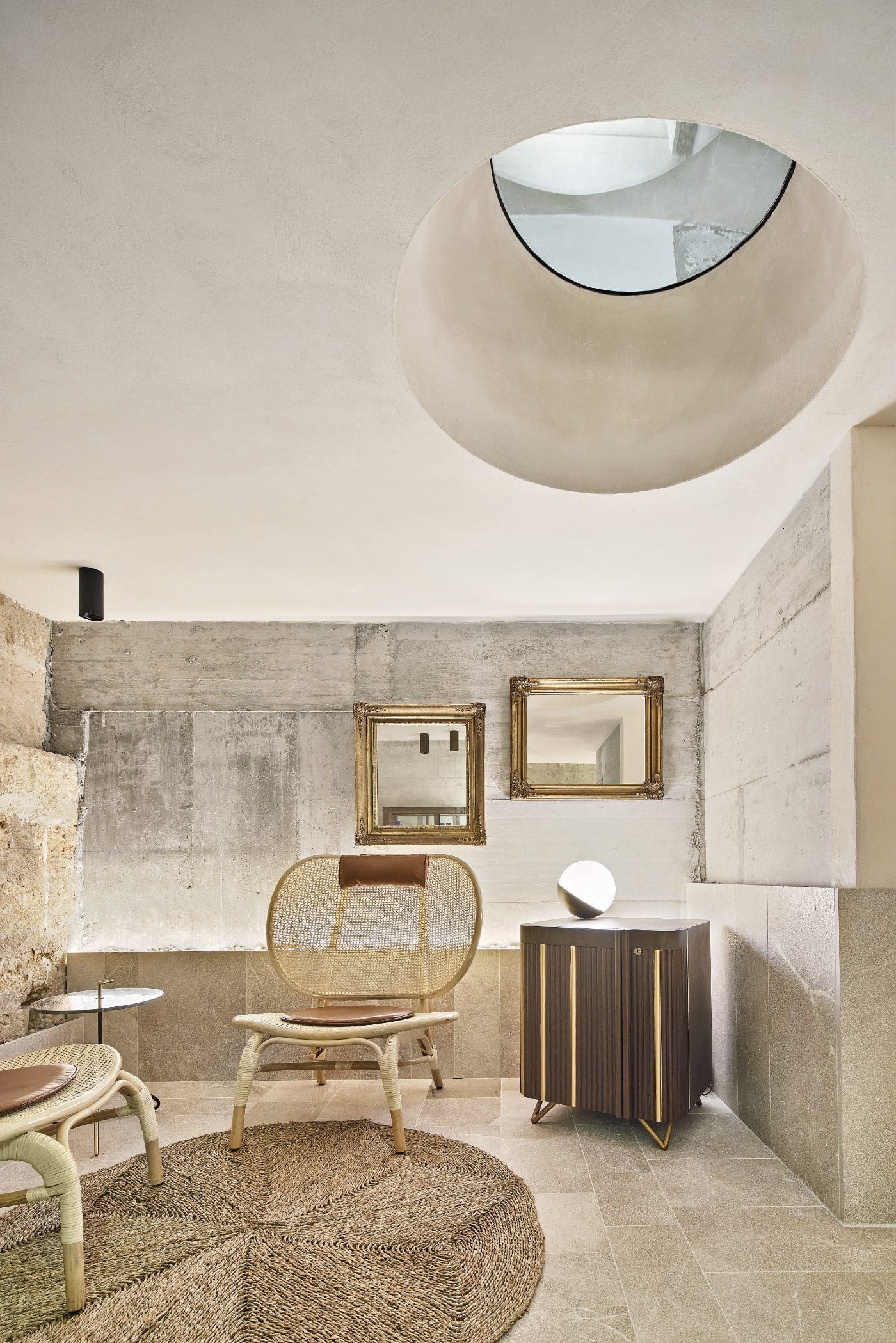 Les antiquités européennes de Paris, Copenhague, Stockholm, Istanbul, sont combinées avec des pièces de différents magasins d’antiquités à Majorque, des pièces artisanales de l’île telles que les lampes Gordiola, des éléments trouvés dans la maison existante, ainsi que certaines pièces de la maison privée du nouveau propriétaire collection. Ces antiquités coexistent avec des meubles contemporains tels que GTV Thonet, Baxter, Moroso, Artemide, Norr, Santa & Cole et Flos, soigneusement sélectionnés et avec des meubles sur mesure conçus par OHLAB spécifiquement pour Can Bordoy.