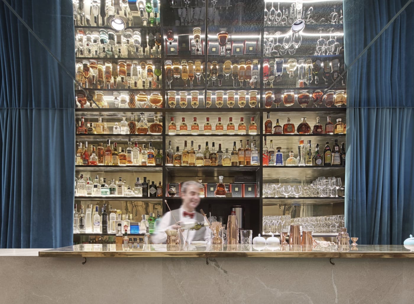 Dans le hall d’entrée, un plafond miroir cache les nouvelles installations et double la hauteur du bar et du rideau de velours qui l’entoure …