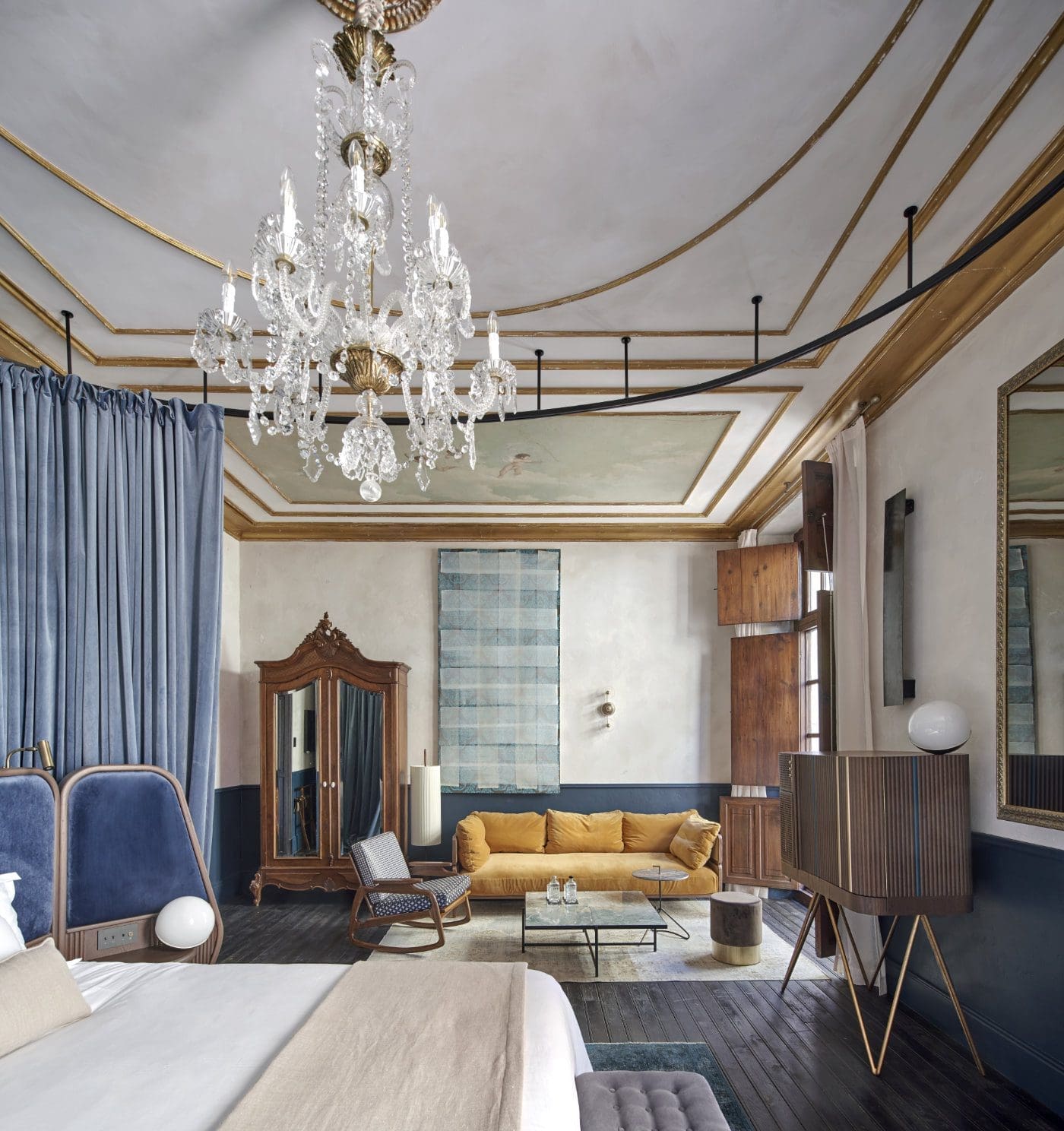 Parmi les meubles sur mesure conçus par OHLAB, une collection de lits et de bars pour toutes les chambres se démarquent. Le lit, avec ses tables de chevet et têtes de lit finies en noyer et en velours et équipé de lampes en laiton vieilli et de boutons-poussoirs en laiton, forme un espace délicat et intime qui contraste avec la texture rugueuse et inachevée des murs et plafonds existants. Le bar, présent dans toutes les pièces dans différents modèles, est un autre élément délicat de confort qui intègre un minibar, un réfrigérateur, un espace de stockage pour les collations, un bureau extensible, un éclairage et un système audio Audio Pro intégré avec une conception personnalisée très facile à utiliser station de bouton en laiton vieilli.