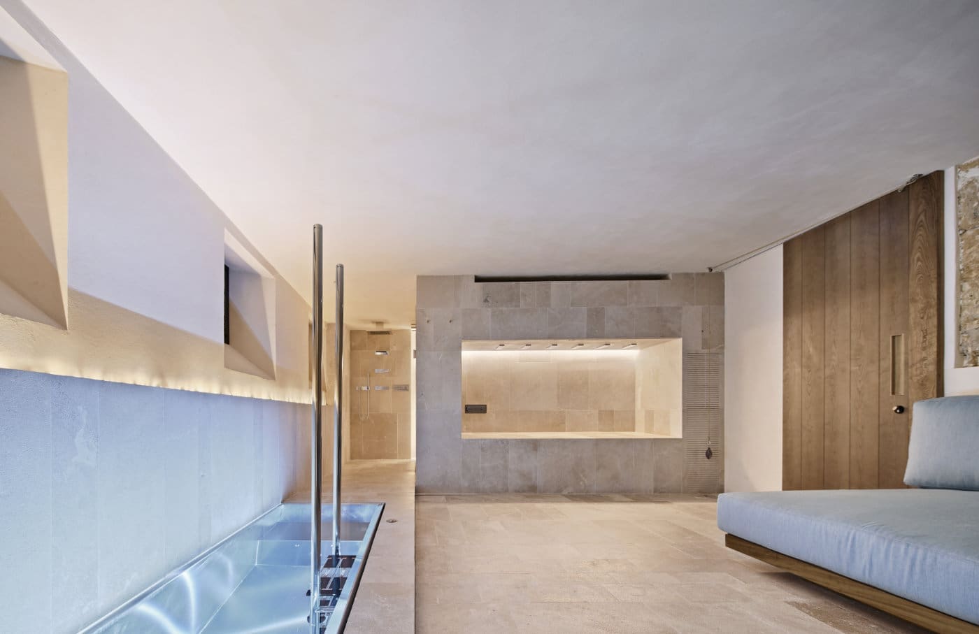 Sur les fondations du bâtiment, nous trouvons l’expérience Spa. Entouré de murs en pierre d’origine du XIIe siècle, de renforcements structuraux brutalistes en béton apparent et de finitions délicates en pierre naturelle, un voyage de sensations aquatiques commence à différentes températures après la culture balnéaire millénaire méditerranéenne.