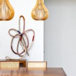 La texture des éléments naturels des meubles, comme le bois et la paille, composent ce cadre rustique et tropical. Le choix de placer des pierres espagnoles dans la zone extérieure était essentiel pour permettre le confort thermique, ainsi que pour rendre une esthétique plus rustique à la maison.