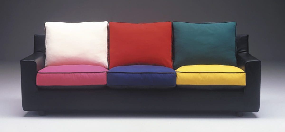 En cuir noir et coussins de tissu coloré modulables, ce canapé conçu en 1988 pour Ligne Roset est l’une des pièces fortes de son appartement, où il côtoie un tapis « Stripe Dialogue » dessiné pour le même éditeur. © Ligne Roset