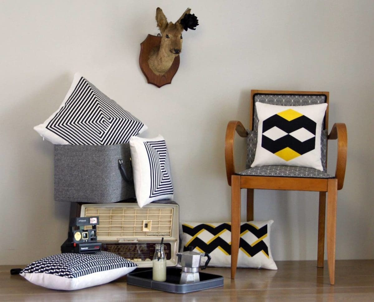 La marque a choisi des motifs d’inspiration graphique et géométrique pour sa première gamme de coussins, vendue principalement dans la région Sud Ouest (Bordeaux, Dax, Anglet & Biarritz) et sur internet.