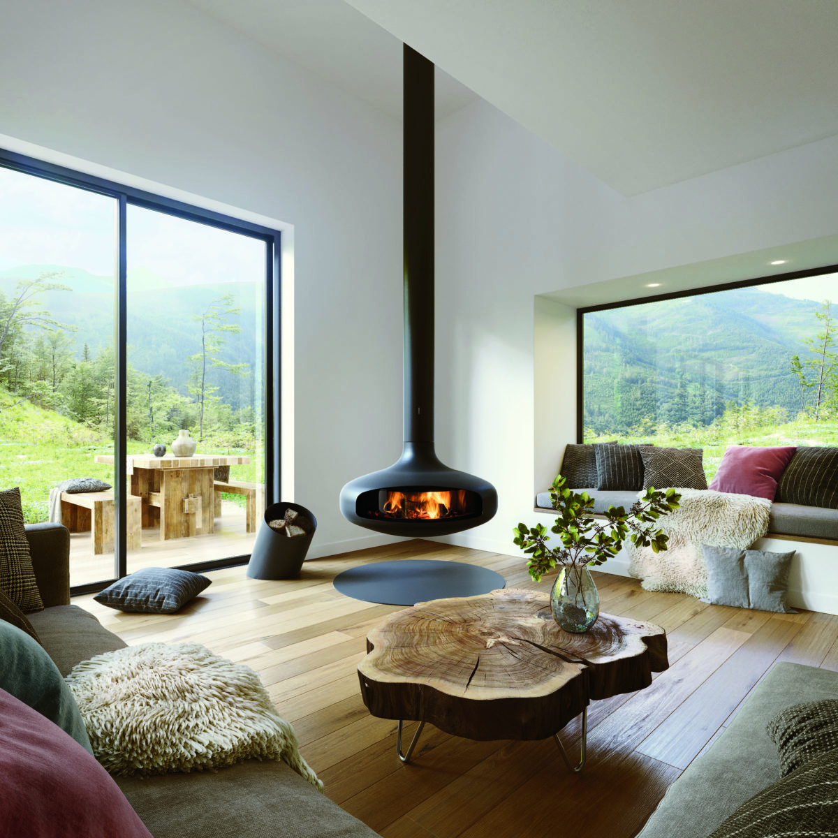 Un look spectaculaire pour cette cheminée à bûches suspendue, pivotant à 360°, dont les parois vitrées coulissantes offrent une vue sur le feu sans risque de projection d’étincelles. « Domofocus », prix sur demande, Focus.