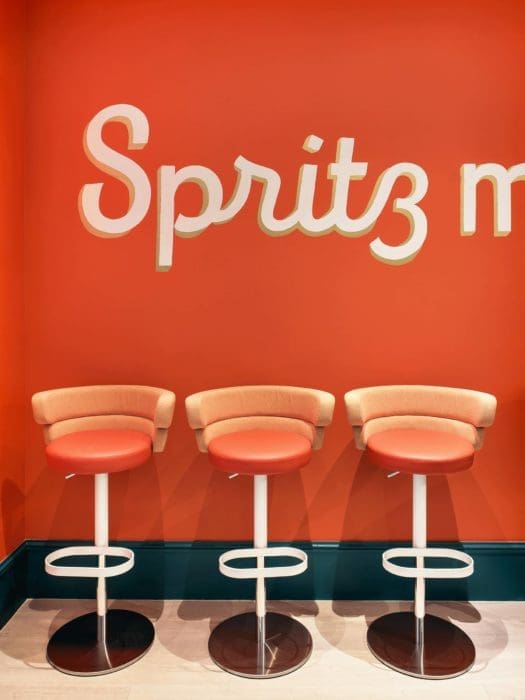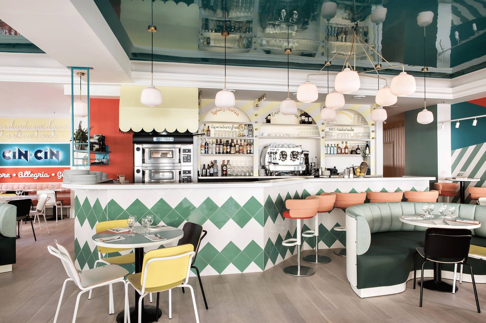 Un espace lumineux de 200 m2, qui concentre toutes les couleurs et le charme de l’Italie. Il est constitué d’une verrière végétalisée et d’une grande salle aux tons doux et poudrés, avec des tables en marbre de Carrare, des banquettes recouvertes de tissus Pierre Frey et des luminaires en opaline. Une harmonie qui nous rappelle les bords de plage et les glaces italiennes…