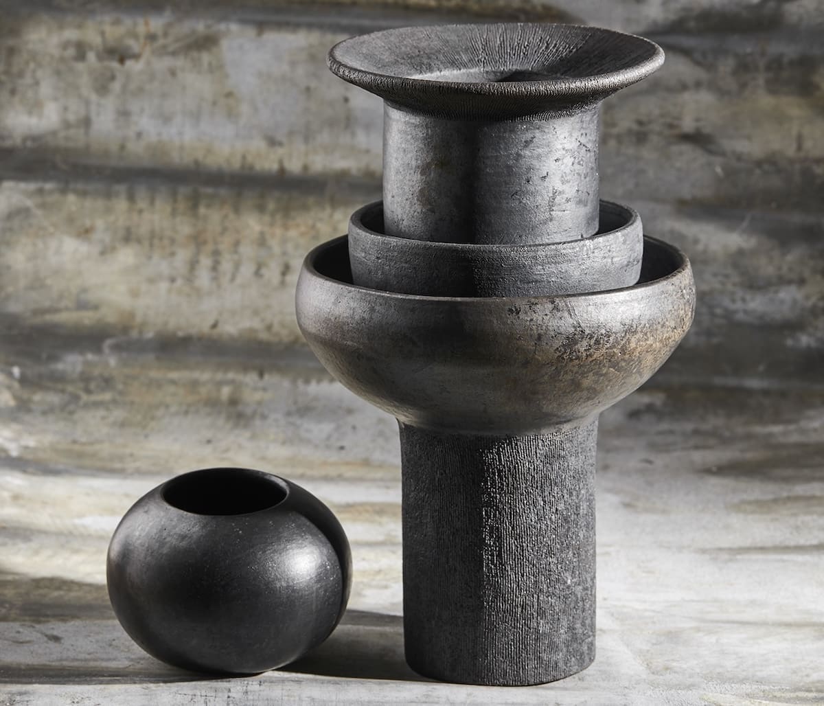 La collection Mezcalienne présente sept vases tout en rondeur. Ludiques par leurs formes et profonds par leur teinte. Constance Guisset a imaginé cette série en 2019, mais elle semble traverser les années sans jamais rien perdre de sa modernité. Et pour cause, la designeuse s’est inspirée de formes traditionnelles mexicaines en y ajoutant une touche contemporaine. Juste ce qu’il faut pour créer un ensemble élégant, qui interpelle sans dénoter. De son voyage au Mexique, au pays de la terre noire, Constance Guisset se souvient d’un « artisanat à l’expression débridée ». Les vases sont réalisés à la main en terre noire, par des artisans mexicains de la région d’Oaxaca et édités par la Maison Marcoux Mexico-Paris.