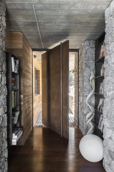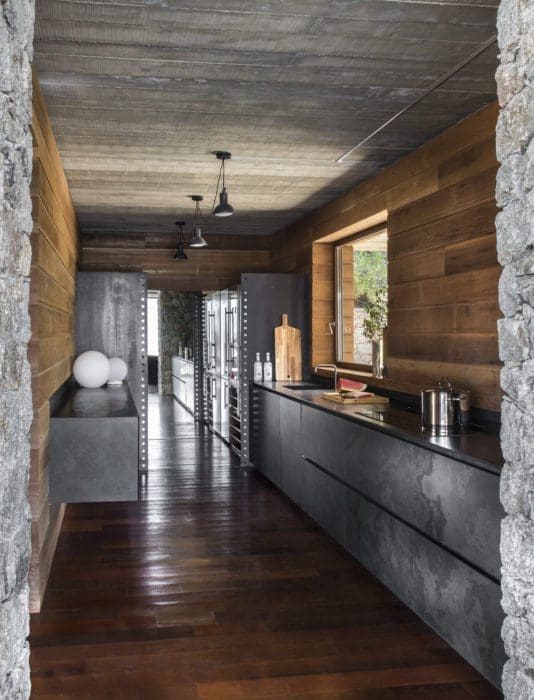 Pas de cloison dans l’espace de vie principal, l’immense pièce qui se prolonge vers une piscine miroir à quatre débordements qui donne l’illusion d’un fondu entre le sol et l’eau. Cette dernière affleure les planches en bois de la terrasse. À la fois chaleureux et bruts, les panneaux de la façade, de la porte d’entrée et du bloc cheminée intérieur sont en plaques d’acier rouillé. Une partie des murs est recouverte d’un parement en pierres sèches de 25 cm d’épaisseur assurant une excellente isolation.