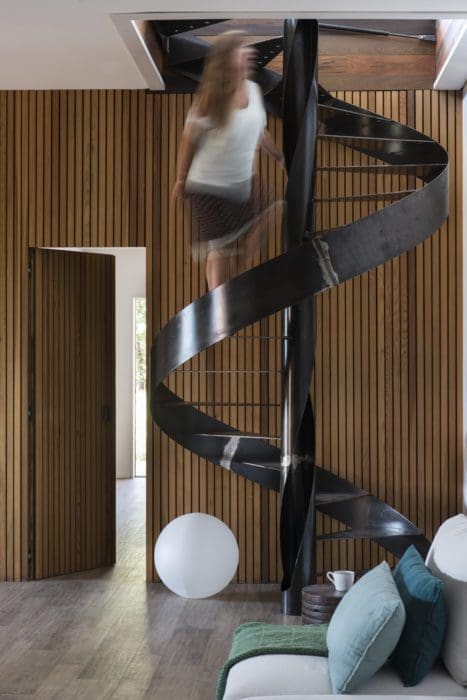 « Notre parti pris est de miser sur les meubles les plus discrets possible, sans pour autant sacrifier au confort moderne », explique Marie. Cette sobriété est renforcée par le plafond en béton brut imprimé avec un coffrage en planches. Toute la partie technique est cachée derrière le tableau en acier rouillé qui sert aussi de support à la télévision. Un immense miroir, qui court du sol au plafond, agrandit la cuisine mitoyenne de la pièce à vivre. Le plan de travail se pare d’une ardoise du Brésil. Un large escalier hélicoïdal en acier ouvragé mène au premier niveau, où sont situées les chambres des enfants.