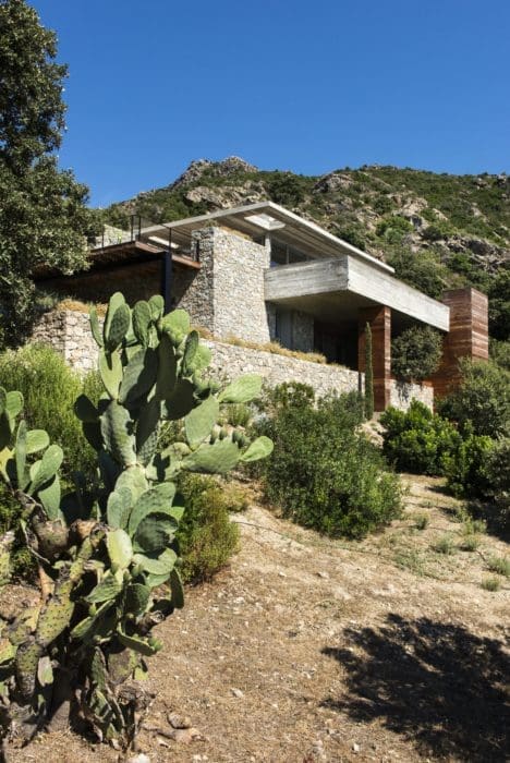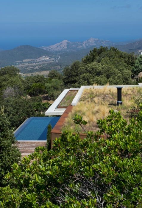 Sur le toit végétalisé, des plantes régionales ont trouvé leur place. Au-delà de son aspect esthétique, ce dernier offre de bonnes performances thermiques en été comme en hiver. Et bien sûr, tout autour, le jardin forme un écrin de verdure et de senteurs. Chênes-lièges, arbousiers, pieds de lavande ont été conservés ou replantés. La bâtisse se blottit dans une colline couverte de maquis. « Nous n’avons sélectionné que des essences endémiques. Pendant huit mois, il a fallu organiser la végétation composée d’espèces locales, comme l’immortelle ou le ciste, pour que celles-ci reprennent leur forme initiale sur et autour