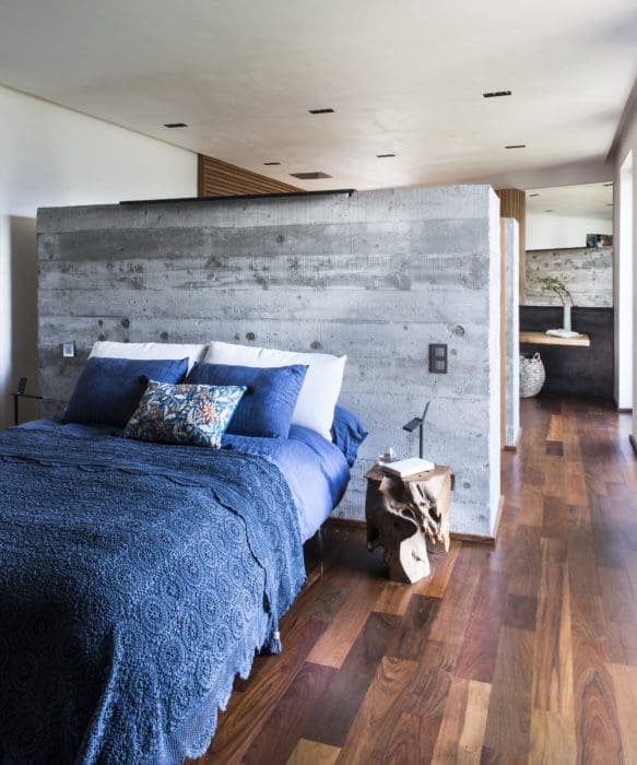 Dans le prolongement du séjour, le parquet en ipé, une essence imputrescible, guide vers la chambre du couple. La suite parentale joue la sobriété élégante des couleurs et des matières avec une tête de lit en béton brut.