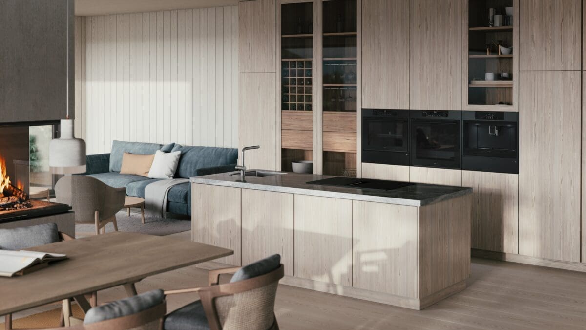 Hotte 90 cm parfaitement intégrée dans une box tout en longueur, faisant corps avec la cuisine. Possibilité d’ajouter des modules de rangement de part et d’autre de la hotte. « Monolith », 2 999 €, Falmec.